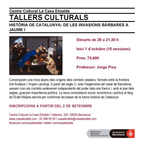 Avui compartim amb vosaltres la informació d’un NOU CURS d’Història de Catalunya que impartirem al Centre Cultural La Casa Elizalde de Barcelona a partir de l’ 1 d’octubre.