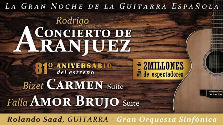 La obra estrella del programa es el Concierto de Aranjuez de Joaquín Rodrigo: la primera obra del compositor escrita para guitarra y orquesta. El guitarrista Rolando Saad la ha interpretado en 900 ocasiones para más de dos millones de espectadores en las principales salas de Europa, junto a las prestigiosas orquestas, como Royal Philharmonic Orchestra de Londres.