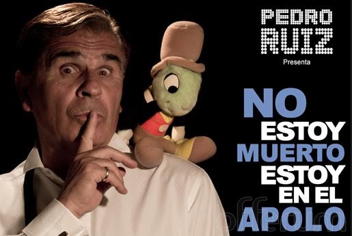 No estoy muerto estoy en el Apolo nos permite ser testigos del regreso, si es que alguna vez se había ausentado, de la personalidad artística más combativa, canalla y crítica de Pedro Ruiz, en la que el presentador, actor, escritor y cantante, entre otras muchas facetas, vuelve a fusionarse con un escenario teatral para hacernos ver la realidad a través de sus ojos, una mirada crítica hacia un mundo desolado por la crisis tanto económica como de valores, de la que ya avisaba Ruiz en sus inicios en la televisión española.