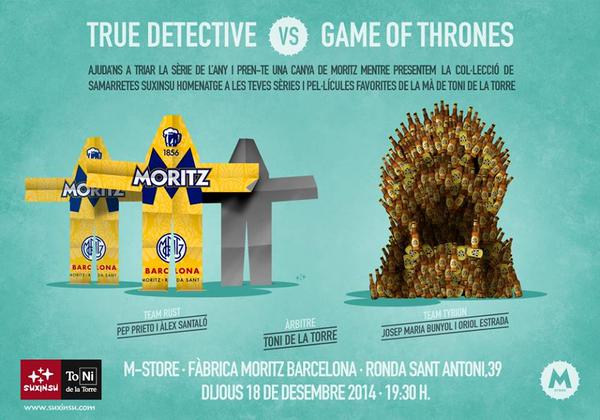 En els darrers anys el fenomen de les sèries s’ha popularitzat de tal manera que els espectadors ens hem acabat tornant verdaders hooligans, seguidors apassionats que defensem les nostres preferències amb un fervor poc justificable i totalment irracional. El crític Toni de la Torre, convençut que confrontar dues propostes exitoses seria un bon espectacle, va decidir organitzar el primer duel de sèries a la Fàbrica Moritz de Barcelona: True Detective vs Game Of Thrones, un original combat serièfil convertit en l’excusa perfecta per a presentar la col·lecció de samarretes Suxinsu, il·lustrades amb motius de les sèries i pel·lícules més conegudes.